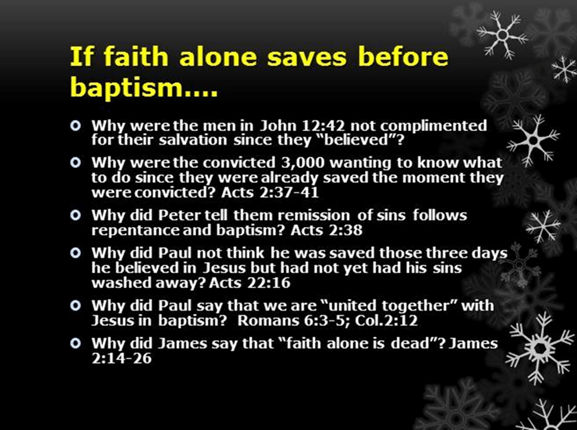 You might be wondering why I even bothered to explain all of those “Why” passages when one of the cardinal rules of biblical interpretation is that “clear” passages can often tells us what  “less clear” passages really mean, or do not/cannot mean. All of the above “Why” questions are asked assuming that water baptism is absolutely required in order to be saved. They completely ignore passages that clearly tell us that salvation is by faith alone.